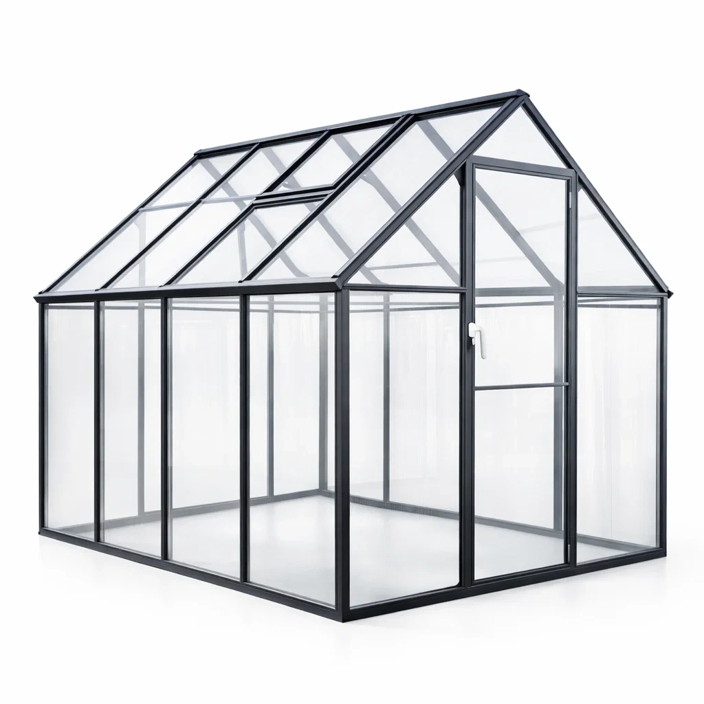 Das Gewächshaus verfügt über einen stabilen Rahmen aus Aluminium und 4 mm dicke Polycarbonat-Paneele. Es misst 250 cm in der Länge, 190 cm in der Breite und 195 cm in der Höhe. Der Rahmen ist Schwarz, und die Paneele sind Transparent.